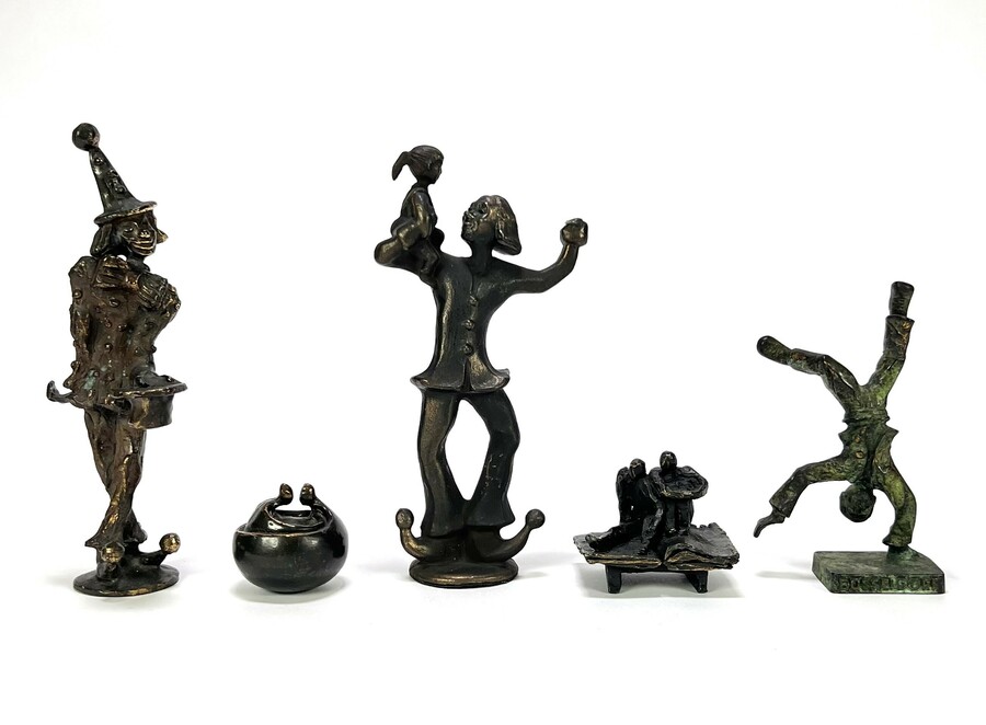 Vijf beelden uit de 21e eeuw, vervaardigd uit donker gepatineerd brons met gietwerk door Corry van Ammerlaan en anderen. De kavel omvat een pierrotachtige figuur, een acrobaat in handstand, een klein rond doosje en twee figuurlijke miniaturen op losse voet.