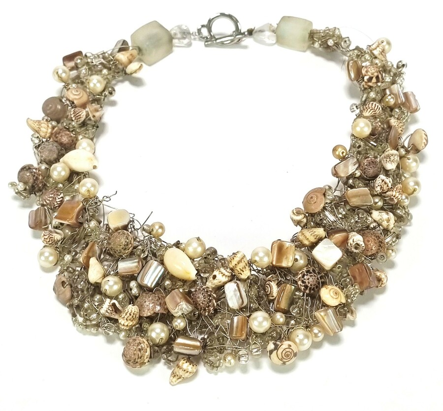 Halsketting van metaal uitgevoerd met een rijk decor van diverse schelpen, gefacetteerde glaskralen en crèmekleurige plastic parels. De halsketting kenmerkt zich door het complexe vlechtwerk van fijne metaaldraden waarin de verschillende elementen zijn verwerkt. Datering eind 20e eeuw.