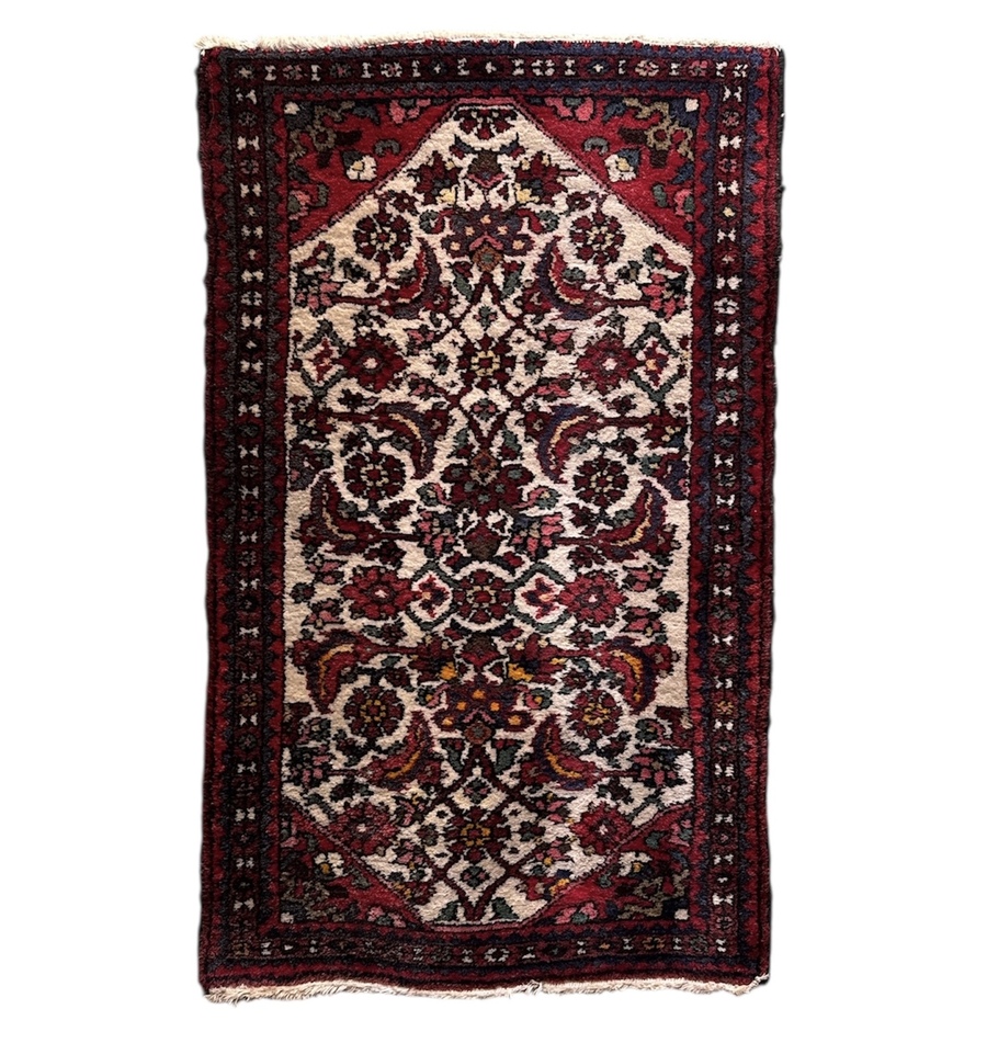 Kashan-kleed uit het midden van de 20e eeuw, vervaardigd met asymmetrische Senneh-knoop in wollen pool op katoenen inslag. Het kleed toont een centraal floraal medaillon met bijbehorende hoekstukken op een dieprood veld. Het kleurenpalet wordt beheerst door meekrap rood, indigo blauw en ivoorwitte accenten in de nevenborders. De hoofdrand vertoont doorlopende palmetten. Het kleed heeft een Centraal-Perzische herkomst.