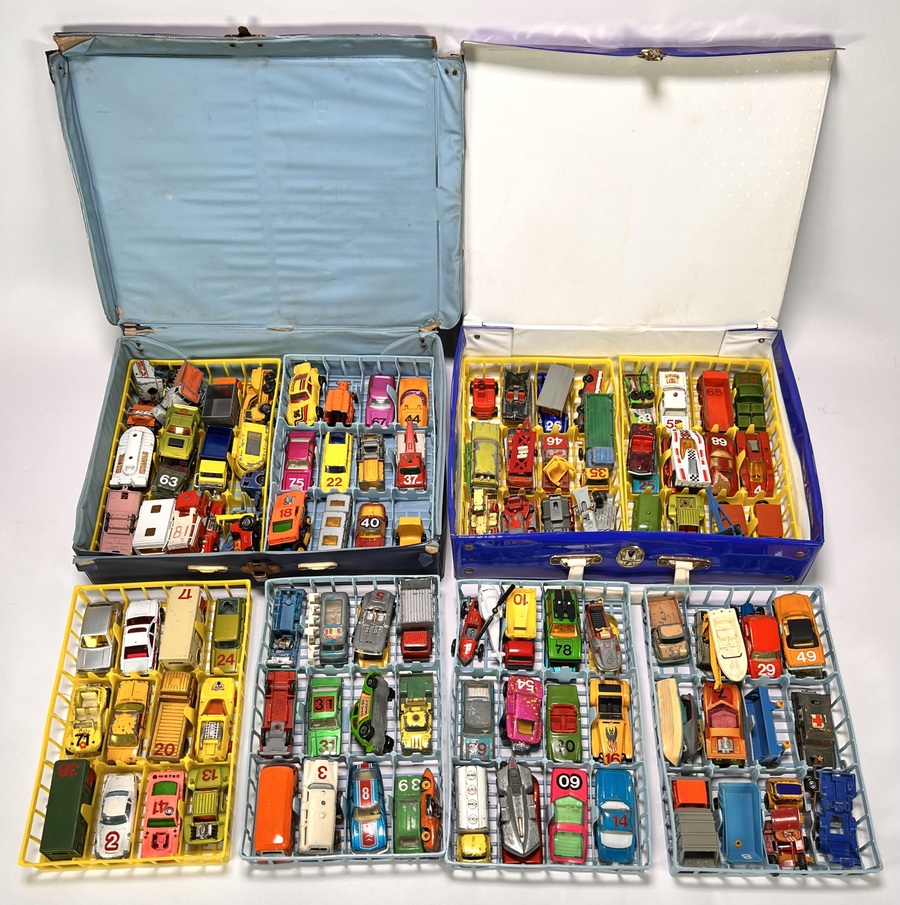 Verzameling van Matchbox, Majorette en diverse merken speelgoedauto's vervaardigd uit gegoten metaal met kunststof onderdelen. De omvangrijke verzameling omvat diverse personenwagens en bedrijfsvoertuigen, ondergebracht in twee originele vinyl opbergkoffers. De verzameling dateert uit de periode 1960–1980 en heeft een Europese herkomst.