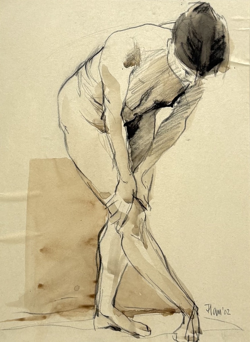Tekening uitgevoerd in inkt en sepia op papier, toont een voorovergebogen vrouwelijk naakt in moderne stijl. Rechtsonder onduidelijk gesigneerd en gedateerd. De tekening dateert uit 2002 en heeft een Europese herkomst.
