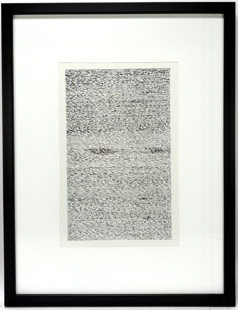 Offset-litho door Jan Schoonhoven (1914–1994), in de minimalistische stijl van de Nul-beweging, toont een repetitief patroon van horizontale arceringen op papier. De grafische structuur creëert een ritmische textuur die kenmerkend is voor zijn oeuvre. De offset-litho dateert uit 1985 en heeft een Nederlandse herkomst. Voorzien van een zwarte lijst met wit passe-partout.