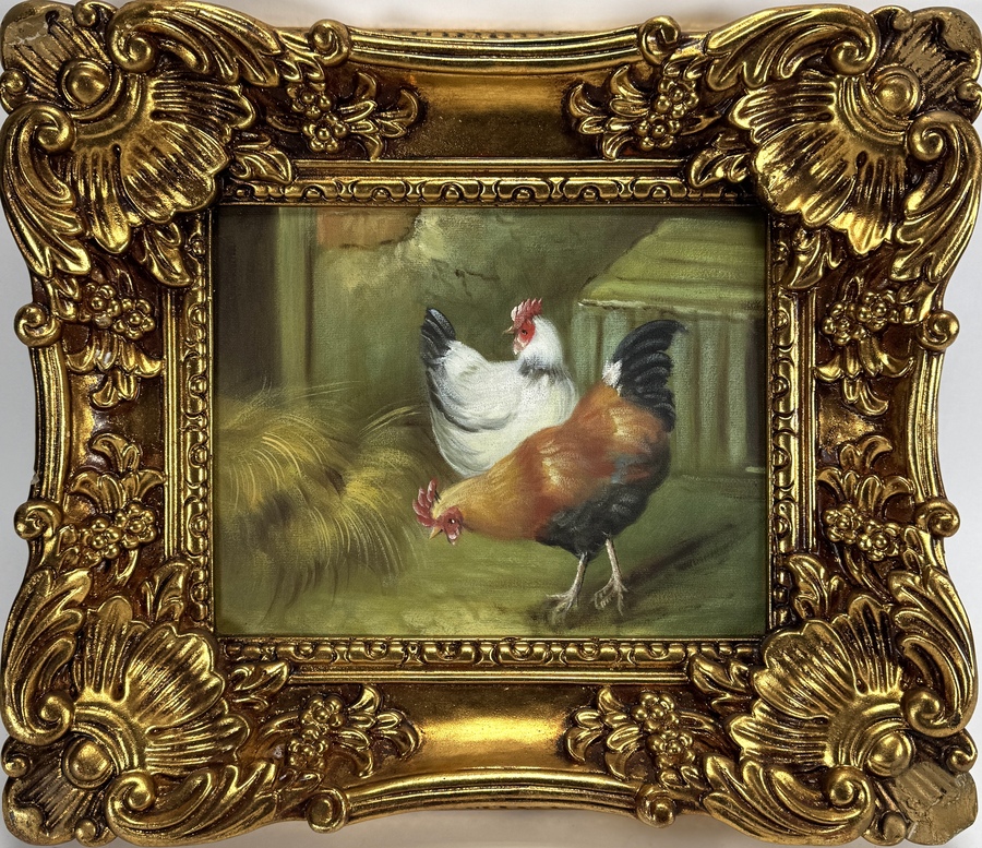 Schilderij toont twee kippen in een stalinterieur in academisch realisme, uitgevoerd in olieverf op doek. Het schilderij is ongesigneerd en dateert uit de tweede helft van de 20e eeuw. De herkomst is West-Europa, in een goudkleurige lijst met rijke florale reliëfversiering in de hoeken.