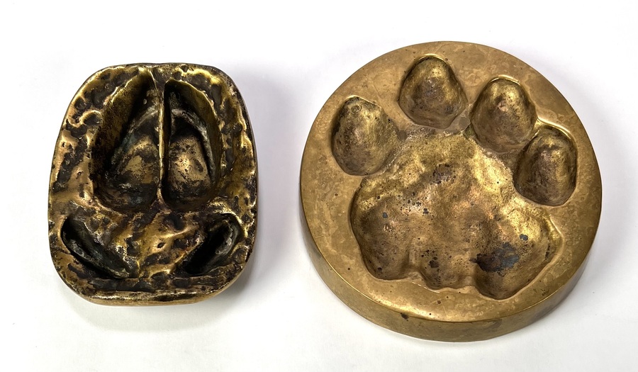 Pootafdrukken van een Panthera Leo en Puma Keiler, uitgevoerd in messing met een naturalistisch reliëf. De gietstukken tonen de gedetailleerde anatomie van pootafdrukken van een Afrikaanse leeuw en een wild zwijn. De onderzijden zijn voorzien van identificerende teksten en copyright-vermeldingen. Datering circa 1970 en een herkomst in Afrika.
