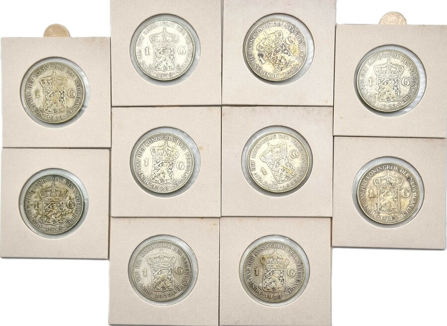 Zilveren guldens van koningin Wilhelmina uit 1929-1943, 720/1000 zilver. De verzameling omvat tien stuks, waaronder munten geslagen te Utrecht en de Verenigde Staten. De voorzijde toont het portret van Wilhelmina met opgestoken haar, de keerzijde het gekroonde Nederlandse rijkswapen.
