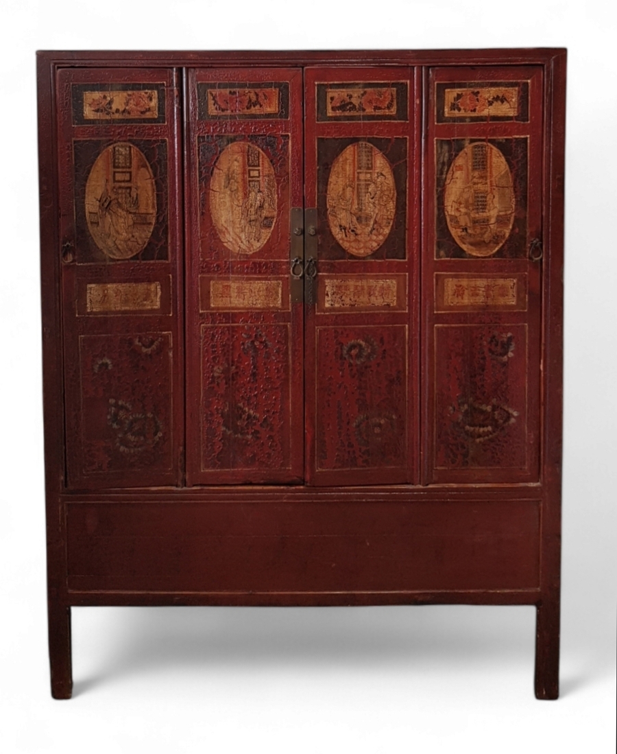 Kast uit de Qing-periode, vervaardigd uit hout met rood lakwerk en voorzien van handbeschilderde decors. De vier deuren tonen ovale medaillons met figuratieve voorstellingen van figuren in een interieur. Kenmerkend is het gecraqueleerde oppervlak en de rechthoekige cartouches met kalligrafie. Voorzien van messing beslag en ringgrepen. De kast dateert van omstreeks 1900 en heeft een herkomst in China.