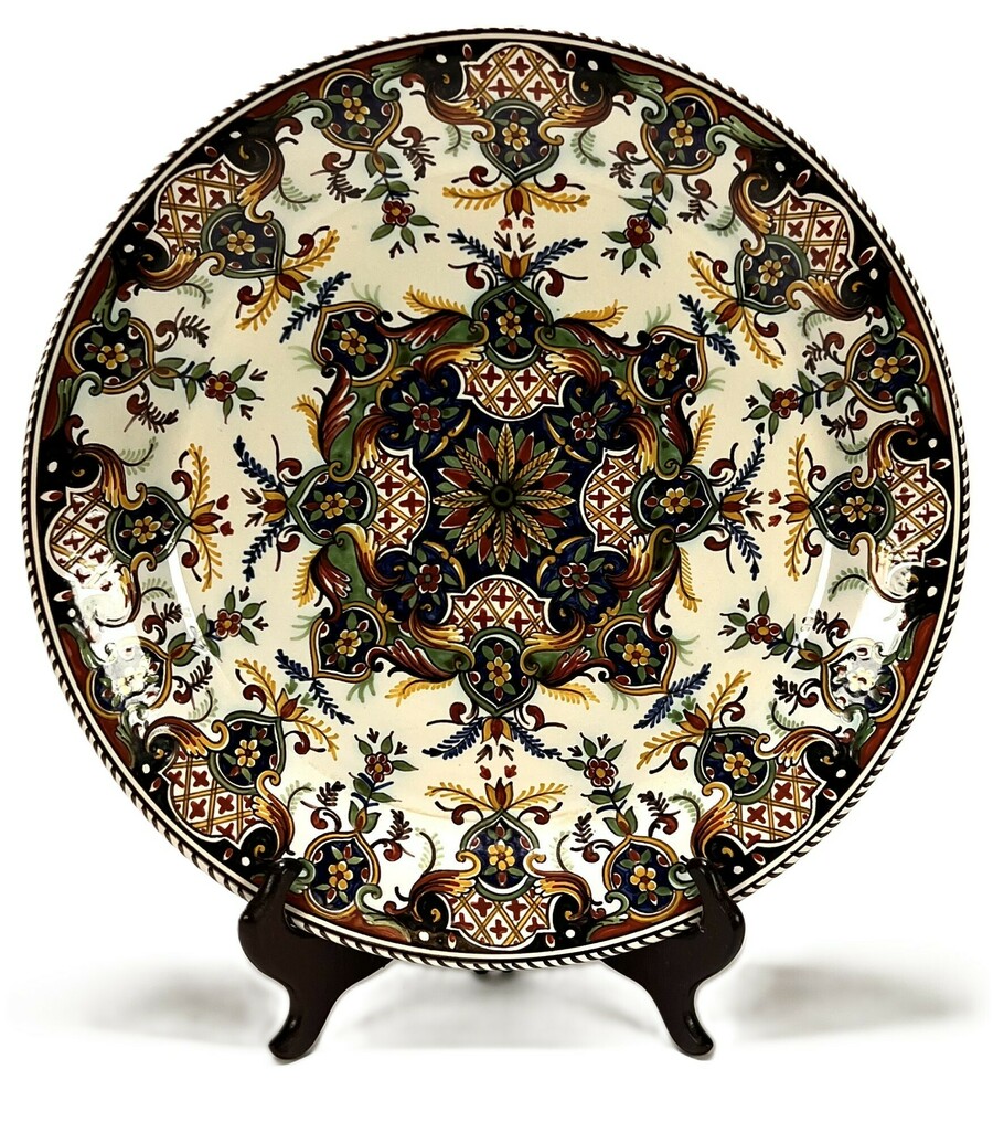 Wandbord van het Fries Aardewerk- en Tegelatelier Arum, vervaardigd uit aardewerk met een handgeschilderd tinglazuur decor. Het wandbord toont een polychroom floraal motief in diepblauw, oker en groen. Achterzijde gemerkt, datering circa 1975 en een Nederlandse herkomst.
