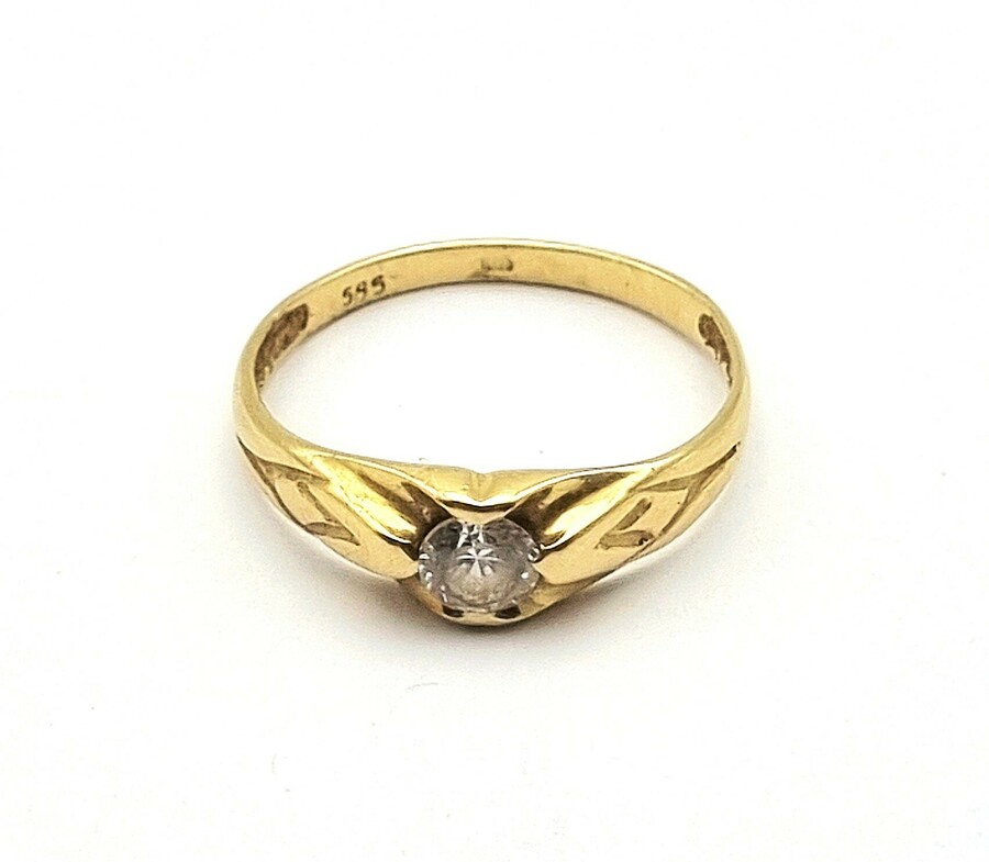 Gouden 14-karaats ring met een centrale steen in briljant slijpsel, gevat in een robuuste kastzetting. De geelgouden band loopt naar de bovenzijde breed uit en is gedecoreerd met gestileerde geometrische graveringen op de schouders. De ring is aan de binnenzijde voorzien van het 585 gehaltemerk, datering midden 20e eeuw.