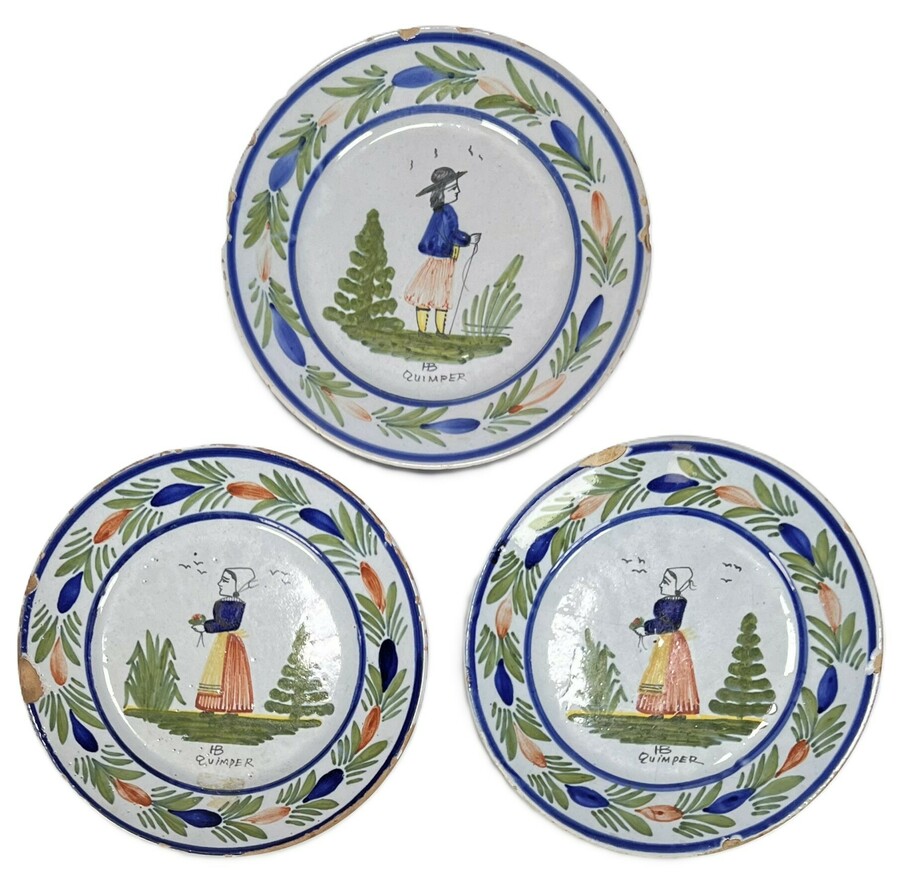 Borden van Faiencerie Quimper, vervaardigd uit aardewerk met een handbeschilderd decor van Bretonse figuren in een landschap. De borden tonen de karakteristieke polychrome beschildering met florale motieven langs de randen, uitgevoerd op een lichtgrijze tinglazuur ondergrond. Elk exemplaar is voorzien van een centrale voorstelling en gesigneerd op de voorzijde. De borden dateren uit de 20e eeuw en hebben een Franse herkomst.