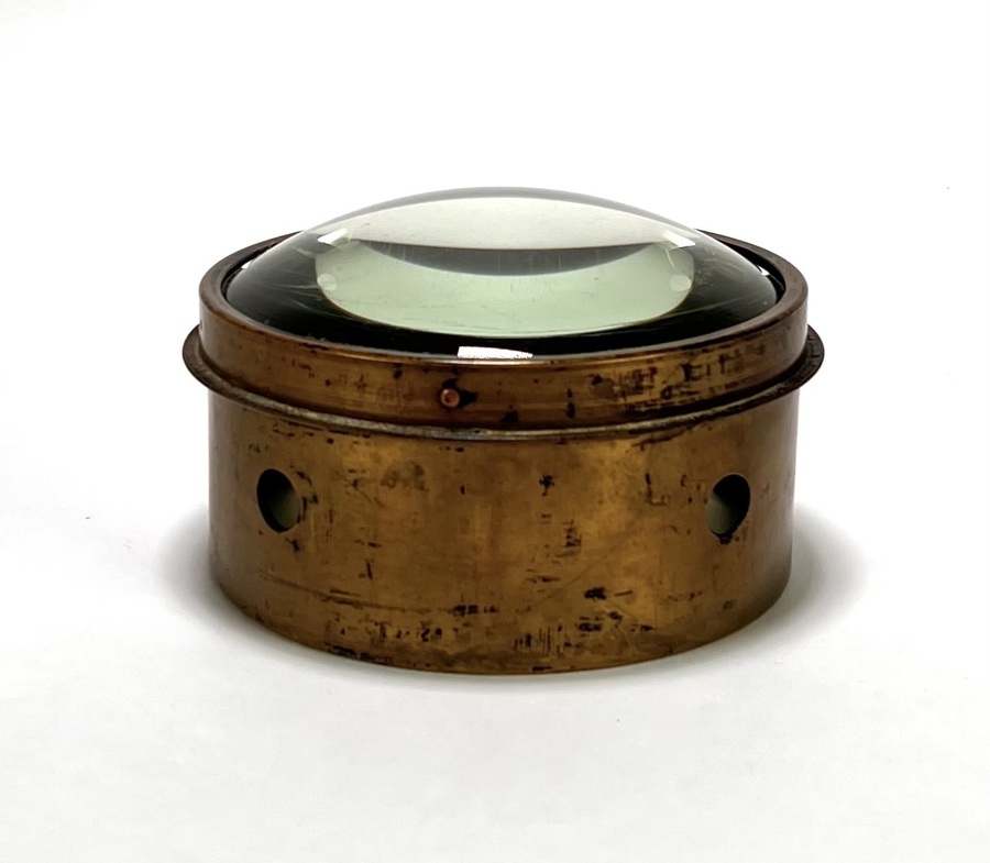 Loep in maritieme stijl, vervaardigd uit messing met een dikke geslepen glazen lens. De cilindrische voet is voorzien van ronde openingen voor lichtinval, de zware uitvoering zorgde voor stabiliteit tijdens het gebruik.De loep dateert uit de eerste helft van de 20e eeuw en heeft een Europese herkomst.