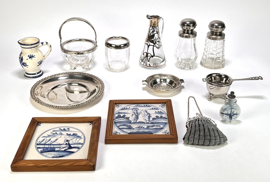 Curiosa vervaardigd uit verzilverde items, glas en keramiek met verschillende technieken. De verzameling omvat onder andere een karaf met verzilverd Art Nouveau montuur, Delfts blauwe wandtegeltjes in houten lijsten en een verzilverd tasbeugeltje. Datering eerst helft 20e eeuw en een West-Europese herkomst.