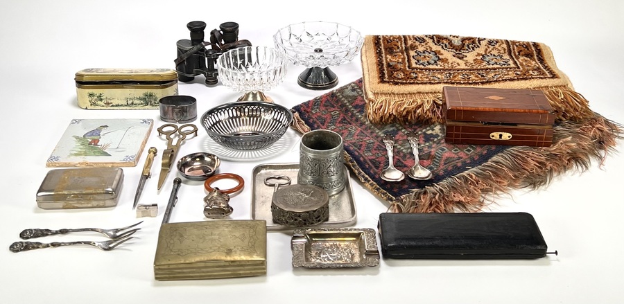 Curiosa vervaardigd uit materialen zoals kristal, metaal en textiel. Onder meer geslepen kristalwerk, zilverkleurig tafelbestek, een tegel en een rammelaar. Datering midden 20e eeuw en een voornamelijk Europese herkomst.