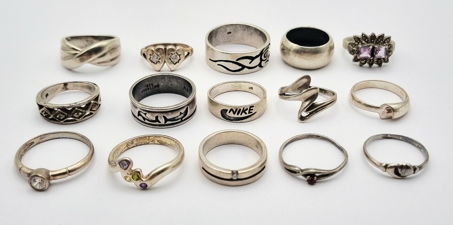 Vijftien zilveren ringen, grotendeels uitgevoerd in eerste en tweede gehalte zilver. De verzameling bevat uiteenlopende ontwerpen, van strakke modernistische bandringen, een ring met het Nike-logo tot verfijnde ringen bezet met diverse stenen. Datering eind 20e eeuw.