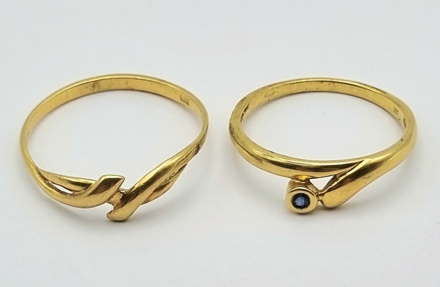 Twee gouden 14-karaats ringen; een ring zonder bezetting en een ring met een kleine blauwe steen. Beide ringen hebben organische lijnen waarbij de uiteinden van de scheen elkaar kruisen aan de bovenzijde. De ringen zijn gekeurd met het Nederlandse eikenblad en het 585-gehaltemerk voor veertien karaat goud. Datering eind 20e eeuw.