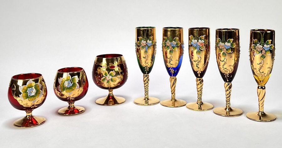 Murano glazen in Venetiaanse barokstijl, vervaardigd uit mondgeblazen glas met 24kt bladgoud en emaille decoraties. De set omvat champagneflûtes en cognacglazen gedecoreerd met handgeschilderde florale motieven in reliëf volgens de traditionele Tre Fuochi-techniek. De gedraaide stammen zijn verrijkt met goudinsluitingen. Datering eind 20e eeuw en een Italiaanse herkomst.