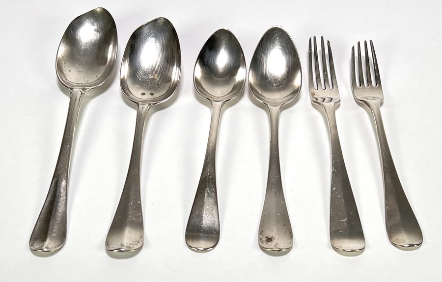Zilveren bestek vervaardigd uit eerste en tweede gehalte zilver. Het lot omvat vier lepels en twee vorken, de achterzijden van elk onderdeel toont diverse zilverkeuren.