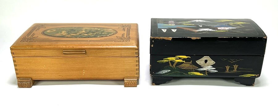 Een muziekdoos met Japanse decoratie en een licht houten juwelenkistje. De zwarte lakdoos toont een berglandschap en bevat een mechaniek met twee dansende figuren op rood velours. Het juwelenkistje is uitgevoerd met een binnenspiegel met gegraveerd roosmotief. Datering tweede helft 20e eeuw.