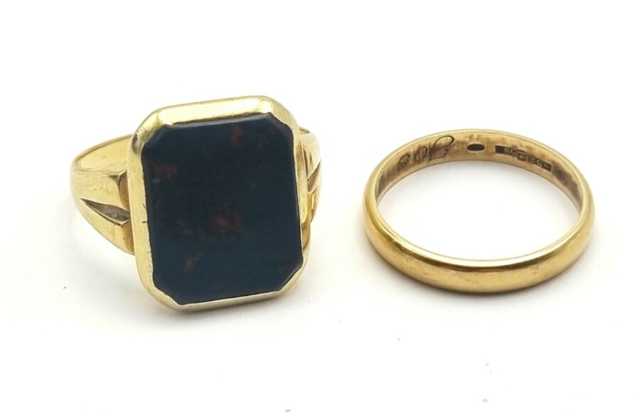 Gouden 14-karaats ringen bestaande uit een zegelring (getoetst) met een rechthoekige donkere steen en een klassieke trouwring gemerkt met eikenblad 585, met inscriptie. De zegelring is uitgevoerd met een trapsgewijze zetting en schouders voorzien van diepgelegen lijndecoratie, de trouwring is gemerkt met het Nederlandse eikenblad voor 585 goud. De ringen dateren uit de tweede helft 20e eeuw.
