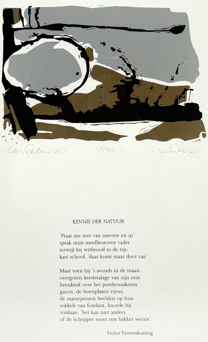 Zeefdruk door Ted Felen (1931-2016), meerkleurige zeefdruktechniek op papier, toont een abstracte wintervoorstelling in modernistische stijl. De afbeelding met aardse bruintinten en grijze vlakken vormt een eenheid met het gedicht "Kennis der Natuur" van Victor Vroomkoning. De zeefdruk is linksonder gesigneerd en gedateerd '02, genummerd 1/150 in het midden en getiteld rechtsonder.
