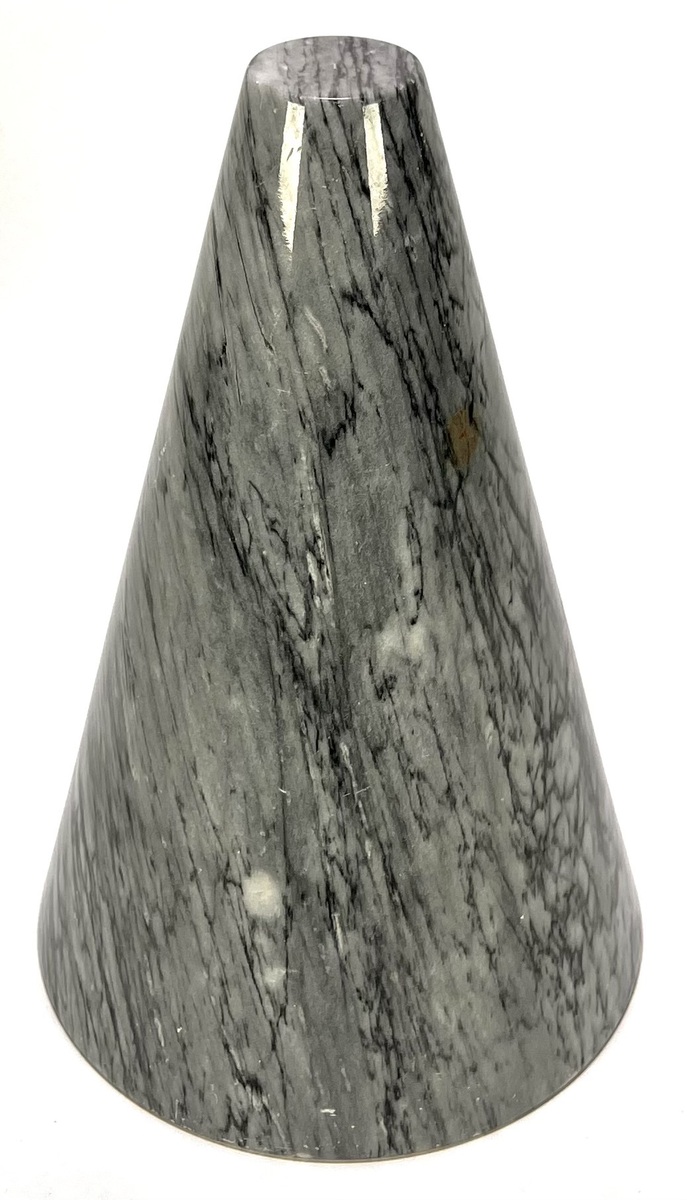 Sculptuur vervaardigd uit massief grijs geaderd marmer met een volledig gepolijst oppervlak. Deze geometrische vormgeving is uitgevoerd als een strakke afgeknotte kegel, waarbij de natuurlijke tekening van het gesteente het verticale karakter toont. Datering circa 1980 en een Europese herkomst.