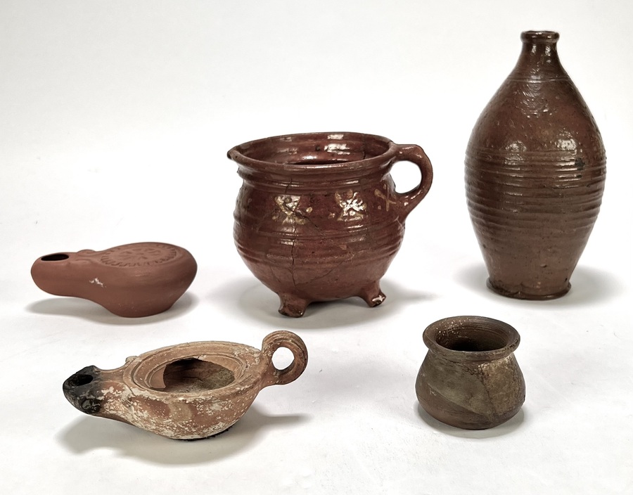Lot aardewerk bestaande uit onder meer een lucerna met verbrandingssporen, een slanke steengoed kruik, een driepotige kookpot met slipversiering en een moderne replica van een olielamp. De objecten tonen diverse oppervlaktebehandelingen zoals zoutglazuur en loodglazuur. Datering 19e/20e eeuw.