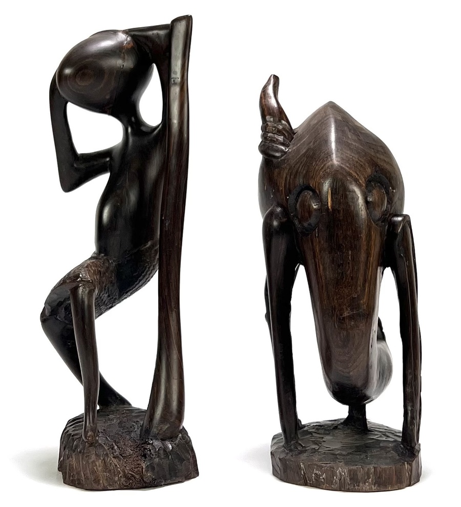Makonde beelden uit Tanzania, tweede helft 20e eeuw, vervaardigd uit massief ebbenhout met een gepolijste glans. Bestaand uit een gestileerde menselijke figuur en een geabstraheerde olifant met verlengde ledematen.