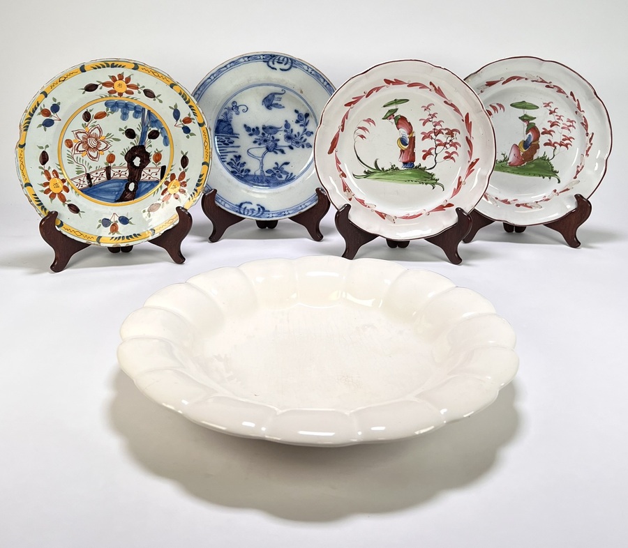 Lot bestaande uit een plooischotel en vier borden vervaardigd uit tinglazuur aardewerk met uiteenlopende decors. De borden uit de 18e eeuw tonen polychrome bloemmotieven, een blauwwit vogeldecor en chinoiserie-voorstellingen met figuren onder een parasol. De crèmekleurige plooischotel met geschulpte rand is gemerkt aan de onderzijde, datering 20e eeuw.