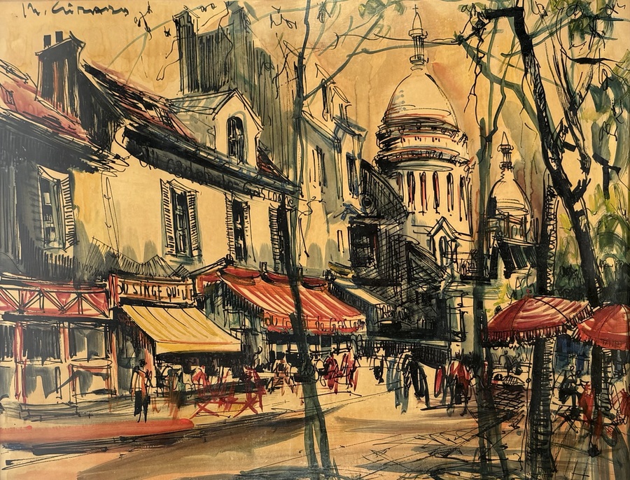 Aquarel door Marius Girard op papier, toont een stadsgezicht van het Place du Tertre in Parijs in impressionistische stijl. De aquarel toont de terrassen van Montmartre met de koepels van de Sacré-Cœur aan de horizon. Gesigneerd linksboven, datering omstreeks 1960.