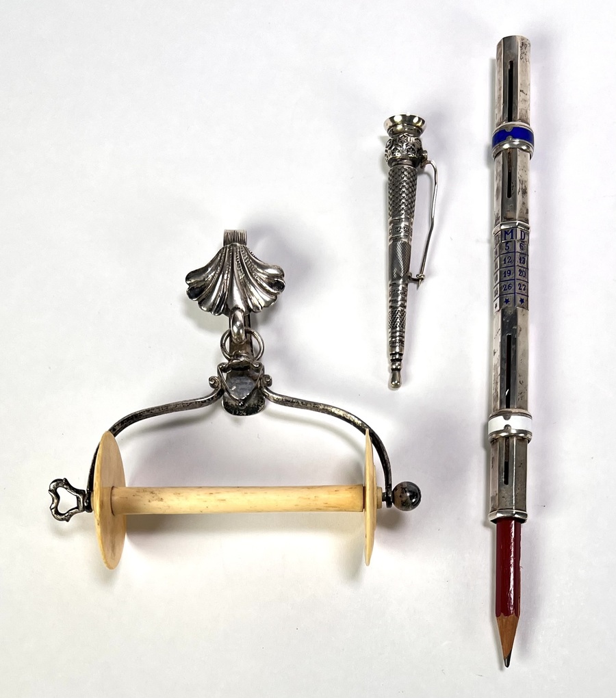 1352. Zilveren kluwenhouder, zilveren broche en verzilverde kalenderpotlood, eind 19e eeuw