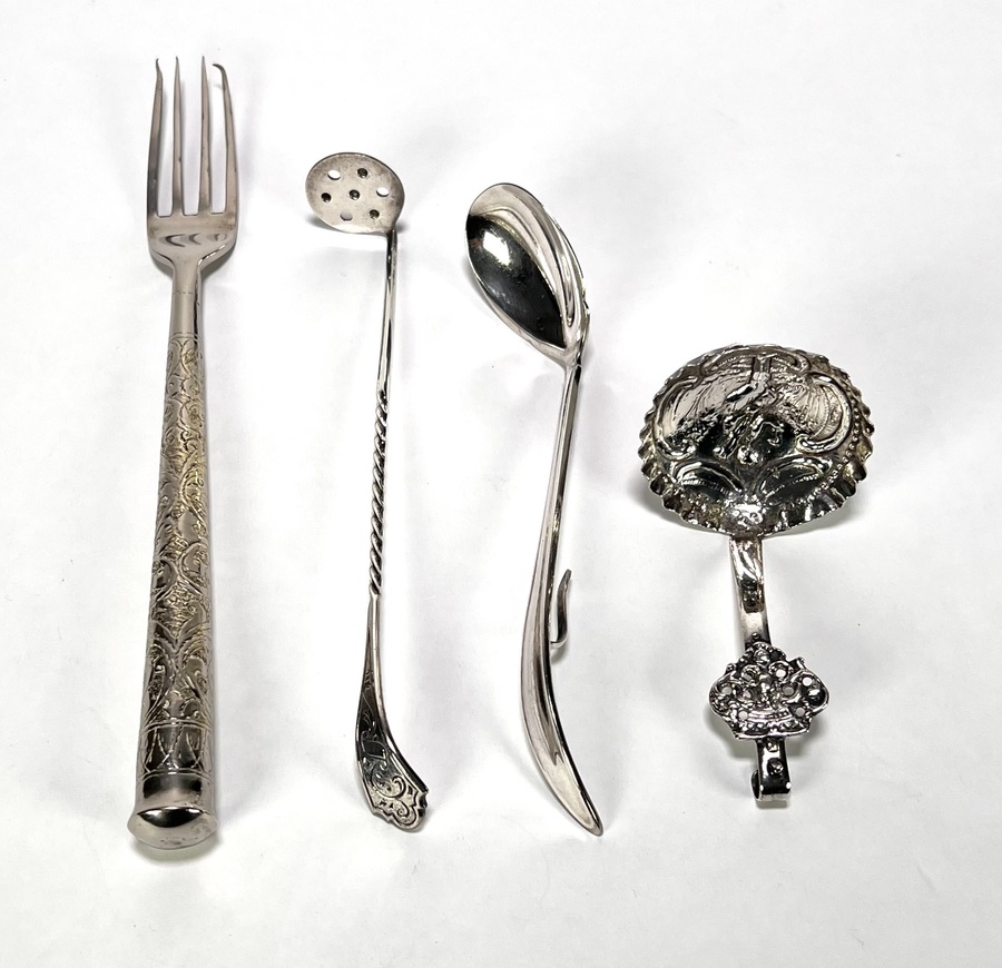 Zilveren en verzilverd tafelzilver; een zilveren roomlepel uit de Art Nouveau periode, vervaardigd uit 835/1000 zilver, gemerkt met lopende leeuw II, minervakop en jaarletter A (1910), een pleet vork met gedreven bloemdecor, een geperforeerde pleet lepel en een ovale pleet roomlepel. Gedateerd 1880–1920