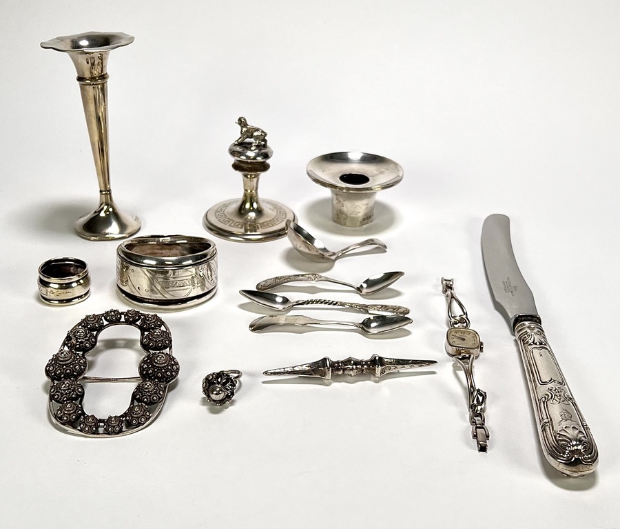 Collectie zilver uit de negentiende en twintigste eeuw, vervaardigd uit divers gehalte zilver. De verzameling omvat onder andere een vaasje, servetringen, diverse theelepeltjes, een presse-papier met hondenfiguur, een ornamentale gesp en een polshorloge. Herkomst: Europa, diverse meestertekens en zilvergehaltes zichtbaar op de randen en stelen.