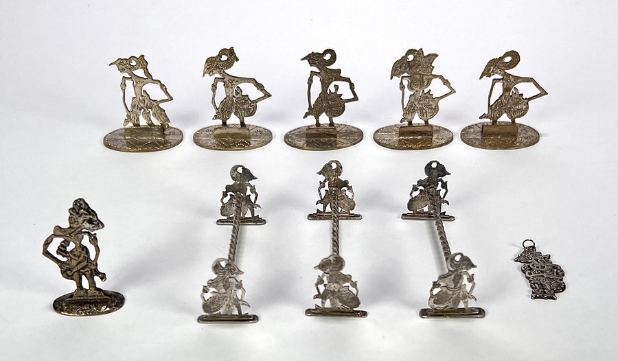 Lot Djokja zilver, vervaardigd uit 800/1000 zilver tijdens de koloniale periode in Nederlands–Indië. Bestaand uit zes menukaarthouders op bewerkte voetjes, drie messenleggers met getordeerde stelen en een hanger. De voorwerpen tonen fijn zaagwerk en geciseleerde ornamentiek van traditionele Javaanse Wajang–personages. Datering circa 1930.