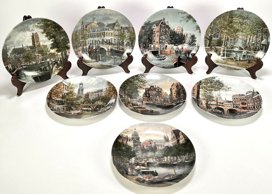 Wandborden van Koninklijke Mosa Maastricht vervaardigd uit porselein met meerkleurige transferdecors naar originele schilderijen van Koos van Loon. De achtdelige serie getiteld "Grachten van Holland" toont diverse stadsgezichten van onder meer Amsterdam, Delft en Utrecht. De gelimiteerde uitgave is aan de achterzijde volledig gemerkt en voorzien van nummers. De wandborden dateren uit 1990–1991 en hebben een Nederlandse herkomst.