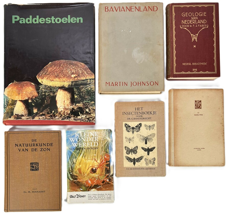 Lot boeken van diverse auteurs, uitgegeven in de 20e eeuw, vervaardigd uit papier met linnen en kartonnen banden. De verzameling natuurhistorische werken omvat titels over mycologie, entomologie en astronomie, waaronder De Natuurkunde van de Zon en Geologie van Nederland. Datering circa 1930–1970 en een Nederlandse herkomst.