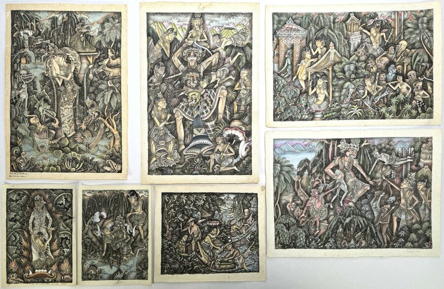 Zeven tekeningen van Dewa Gede Yusayana (1950) en Dewa Made Raka (1945) tonen mythologische taferelen en Balinese dorpsscènes in de Batuan-stijl, uitgevoerd in inkt en gouache op papier. De gedetailleerde composities kenmerken zich door fijnmazige arceringen en een horror vacui-opbouw. Gesigneerd en geannoteerd met Batuan, Bali, Datering circa 1980 en een Indonesische herkomst.