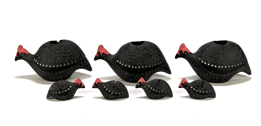 Zeven beelden van L'Artisanat d'Art in hedendaagse stijl, vervaardigd uit gips met een matzwarte engobe afwerking. Bestaand uit drie kaarsenstandaards en vier menukaarthouders in de vorm van gestileerde parelhoenders, gedecoreerd met een wit stippenpatroon en rode accenten. Datering late 20e eeuw en heeft een herkomst in Zuid-Frankrijk.
