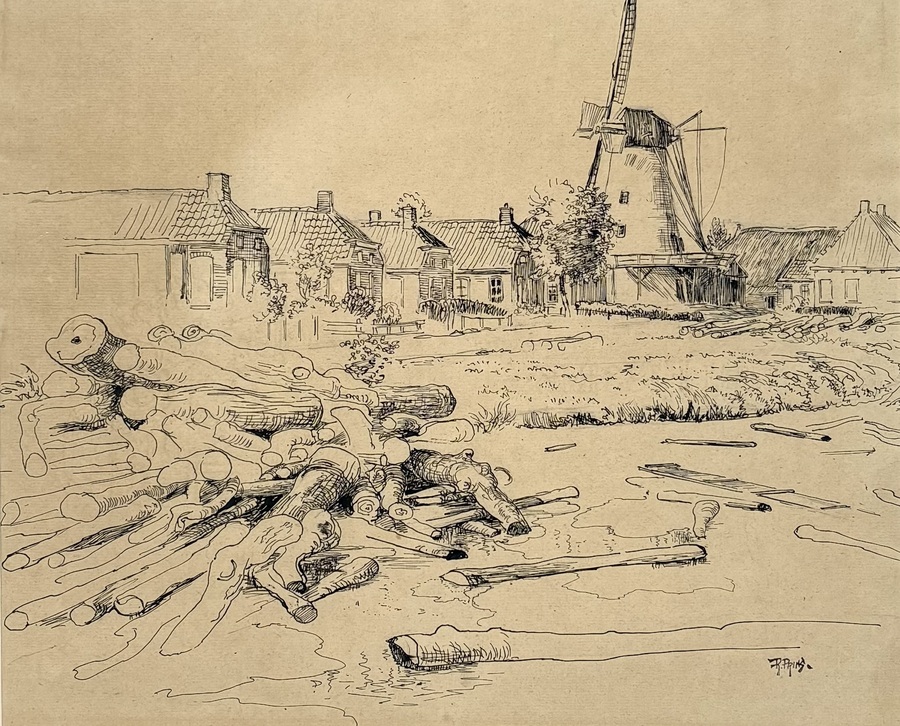 Tekening door Riekle Prins (1905–1954), pentekening op papier, toont een dorpsgezicht met een stellingmolen en gestapeld hout. Gesigneerd rechtsonder, datering circa 1940 en een Noord-Nederlandse herkomst.