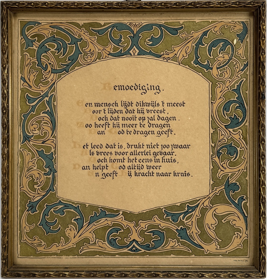 Tekening door Nelly ten Have (1900–1982), uitgevoerd in inkt op papier, toont de spreuk Bemoediging in een gekalligrafeerd lettertype. De omlijsting is in Art Nouveau stijl met gestileerde acanthusbladeren in blauwe en okergele pigmenten. Rechtsonder gesigneerd, datering ca. 1935 en een Amsterdamse herkomst.