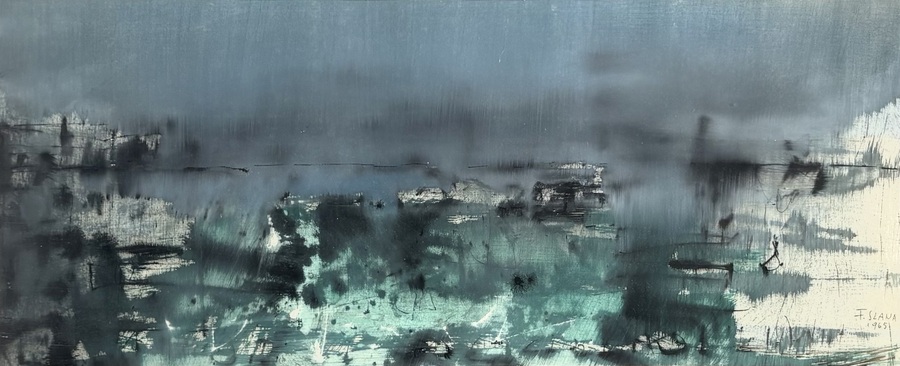 Aquarel door France Slana (1926–2022), uitgevoerd op papier, toont een geabstraheerd landschap in modernistische stijl. De aquarel wordt gekenmerkt door wassingen in turquoise en diepblauw, gecombineerd met zwarte lijnvoering. Rechtsonder gesigneerd en gedateerd 1965. De aquarel heeft een Sloveense herkomst.