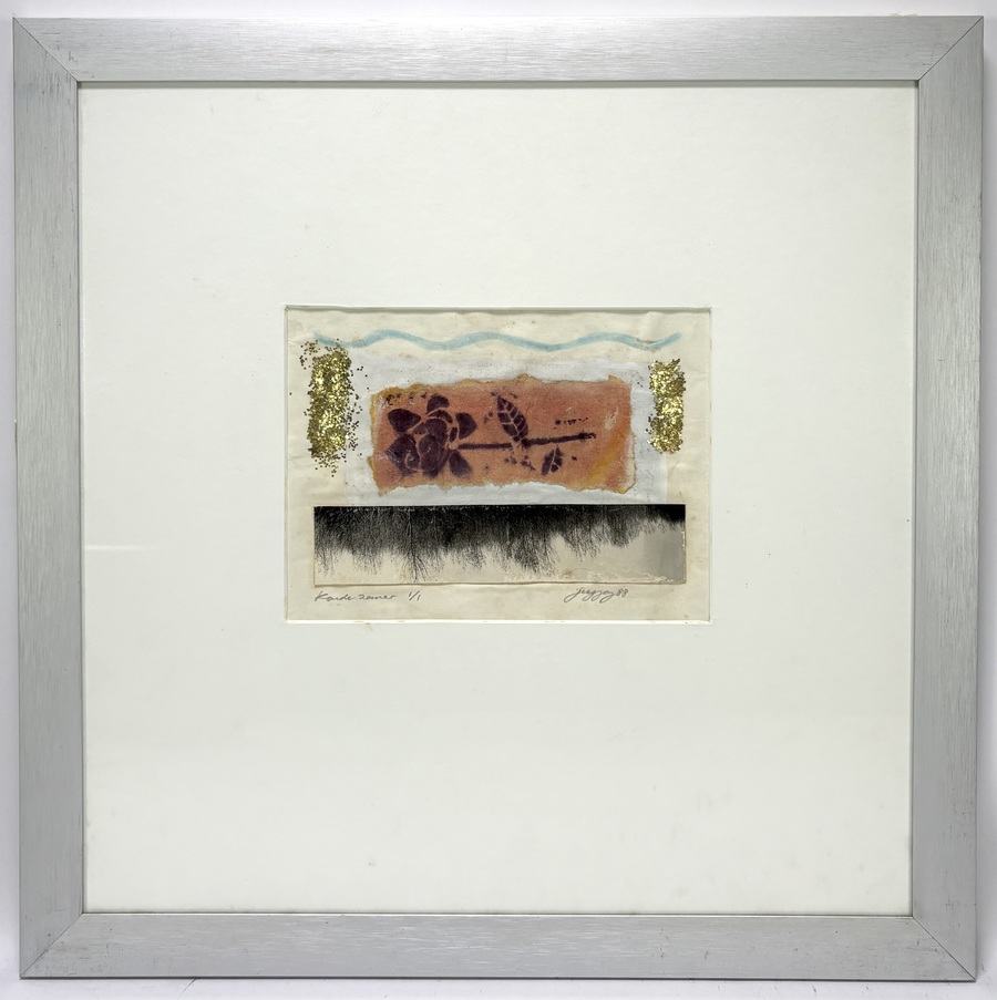 Collage door Jeannette Eisses (1954) toont een abstracte bloemvoorstelling getiteld "Koude zomer" in modernistische stijl, uitgevoerd op papier. De unieke collage combineert grafische elementen met goudkleurige accenten en blauwe golflijnen. Linksonder getiteld en genummerd 1/1, rechtsonder gesigneerd en gedateerd 88. De collage heeft een Nederlandse herkomst
