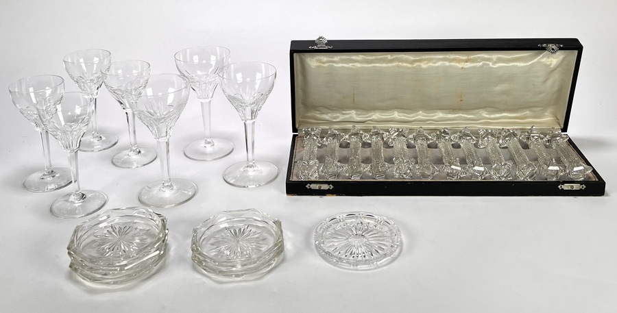 Art Deco kelkglazen, messenleggers en onderzetters toegeschreven aan Val Saint Lambert, vervaardigd uit kristal met facet- en diamantslijpsel. De glazen hebben een conische kelk op gefacetteerde stam, de messenleggers in cassette een verfijnd slijpsel en de onderzetters een radiaal slijpsel. Datering circa 1930 en een Belgische herkomst.