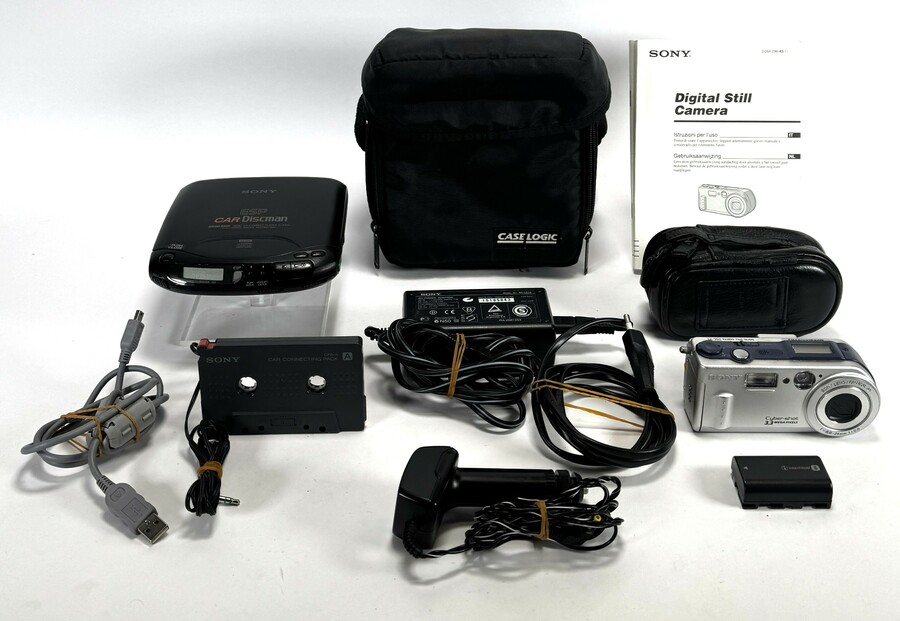 Lot bestaande uit een Sony Discman D-830K, een Cyber-shot DSC-P1 digitale camera en accessoires, uitgevoerd in antracietkleurige en zilverkleurige kunststof behuizingen. Alsook een cassette adapter voor radio's, diverse voedingskabels en een bijbehorende draagtas van Case Logic. Daterend uit de periode 1995–2002 en een Japanse herkomst.