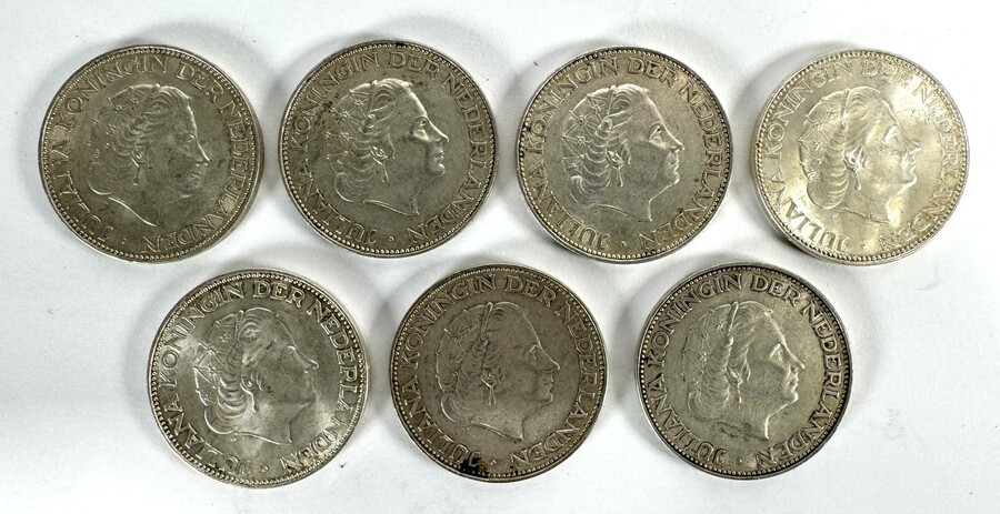 Rijksdaalders van de Rijksmunt Utrecht geslagen tussen 1959 en 1966, vervaardigd uit 720/1000 zilver. De zeven munten toont het linker profiel van Koningin Juliana en op de keerzijde het gekroonde Nederlandse rijkswapen tussen de waarde aanduiding. De zilveren munten wegen 15 gram per stuk en dragen het muntmeesterteken en de Utrechtse mercuriusstaf. Herkomst is Nederland.