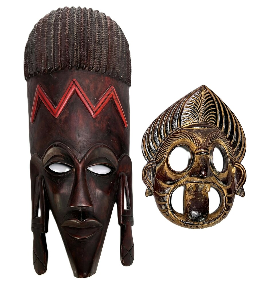 Twee houten maskers uit de tweede helft 20e eeuw. Een masker toont West-Afrikaanse stijlkenmerken met een verlengde voorhoofdspartij en geometrische incisies en het andere masker betreft een polychroom beschilderd Sanni masker uit de Sri Lankaanse traditie met een uitgestoken tong.