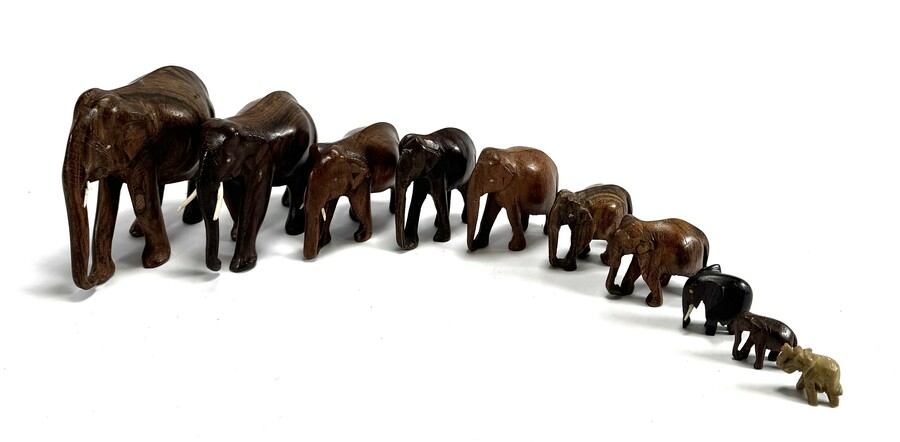 Tien olifanten uitgevoerd in diverse houtsoorten. De kavel bevat olifanten in variërende formaten, deels gedecoreerd met slagtanden van been en tonen naturalistische vormgeving. De olifanten dateren uit midden 20e eeuw en hebben een herkomst in Afrika.
