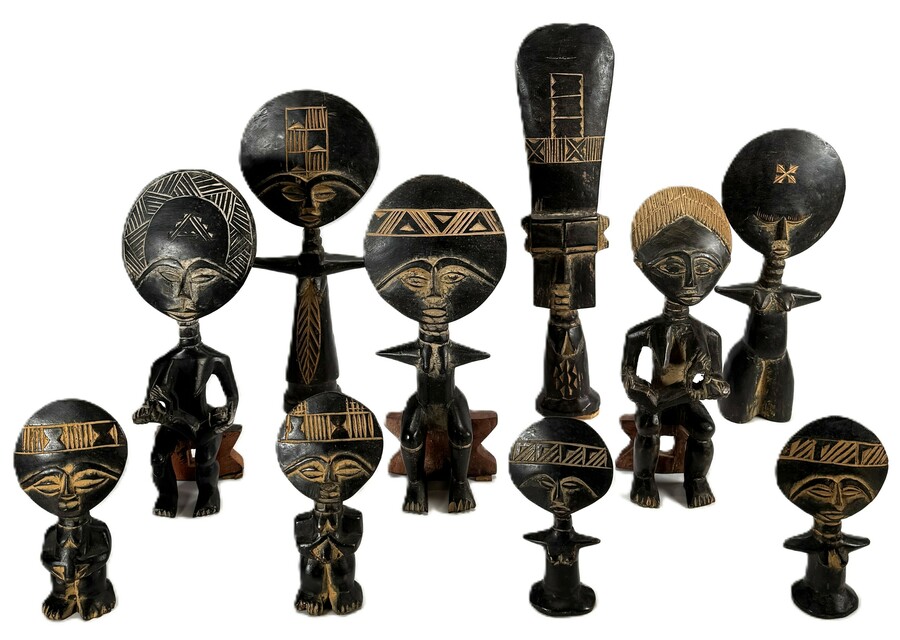 Ashanti stijl beelden uit Ghana, uitgevoerd in donker gepatineerd hout, daterend uit de tweede helft 20e eeuw. De tiendelige collectie omvat diverse Akuaba-vruchtbaarheidspoppen met de typische schijfvormige hoofden en ingesneden geometrische versieringen. De beeldden variëren in zittende en staande houding, waarbij de gestileerde gelaatstrekken centraal staan.