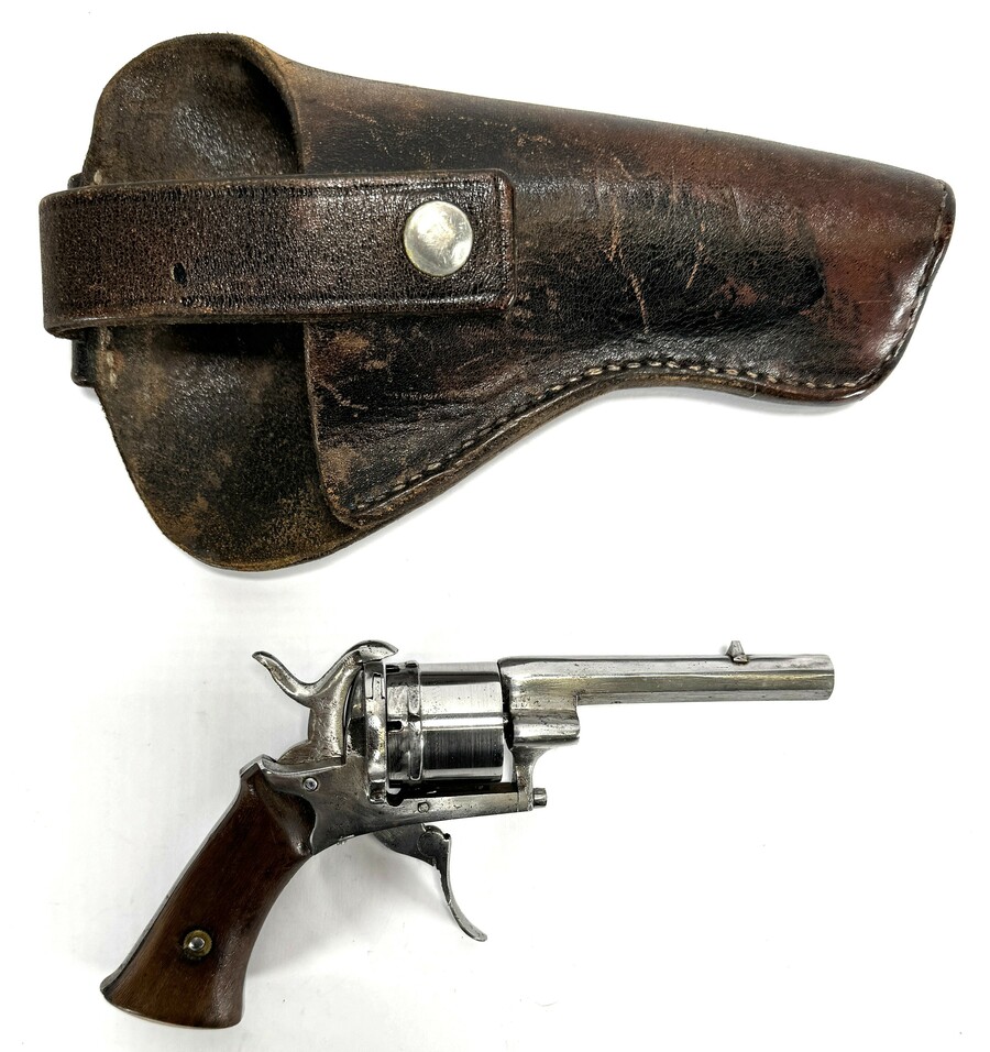 Javaanse zes schots penvuurrevolver met lederen holster uit Yogyakarta, gedocumenteerd in 1923. Het zakmodel toont een achthoekige loop en vouwtrekker. Bijgevoegd een huwelijksuitnodigingen van G.K.R. Madoeretno en de Commandant van de Kraton-garde, K.P.H. Poerwodiningrat, een visitekaartje van Sultan Hamengkoe Boewono VIII en een residentiële uitnodiging voor de koninklijke verjaardag receptie.
