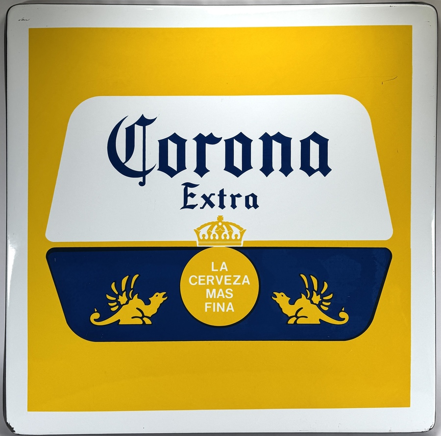 Reclamebord van Guismo, vervaardigd uit emaille met een meerkleurige voorstelling van het biermerk Corona Extra. Het reclamebord toont het logo inclusief de centrale kroon en flankerende griffioenen boven de tekst "la Cerveza Mas Fina". Verso informatie, daterend uit circa 2005 en een Mexicaanse herkomst.