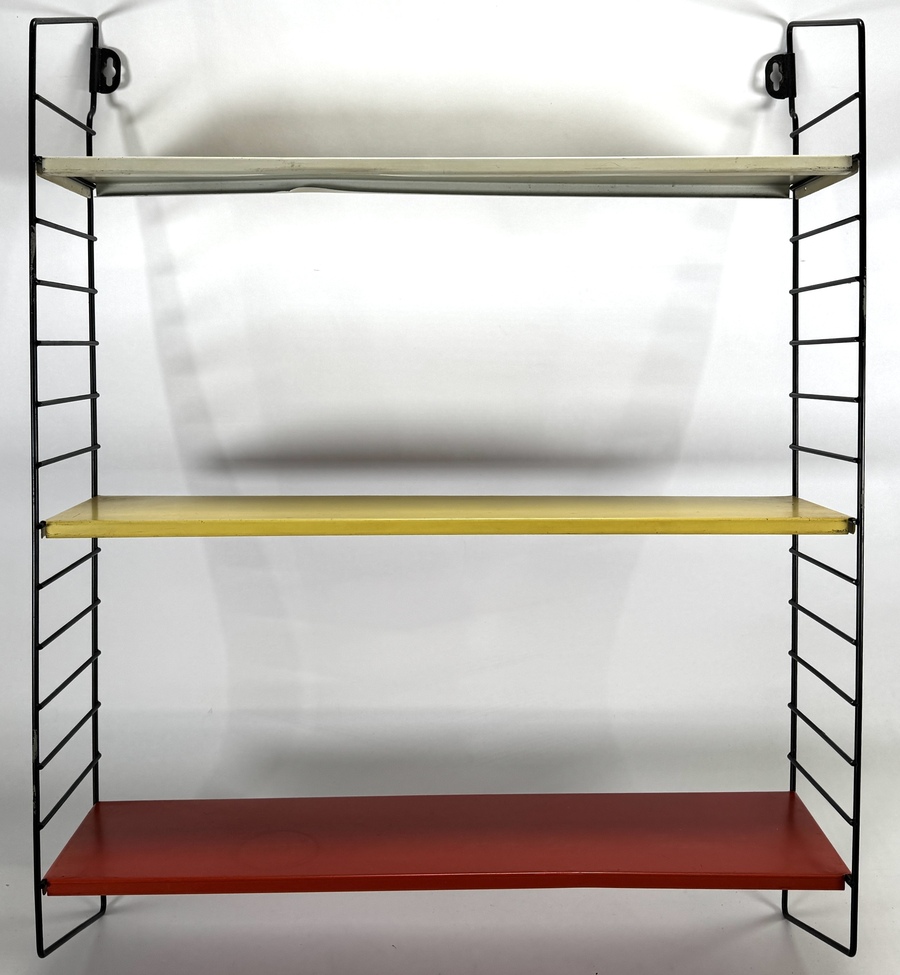 Tomado wandrek ontworpen door Ariaan Dekker uit de Mid-century modern periode, vervaardigd uit zwart draadstaal en meerkleurig plaatstaal. Het modulaire ontwerp bevat drie metalen planken in rood, geel en crème, dateert uit circa 1960 en heeft een Nederlandse herkomst.