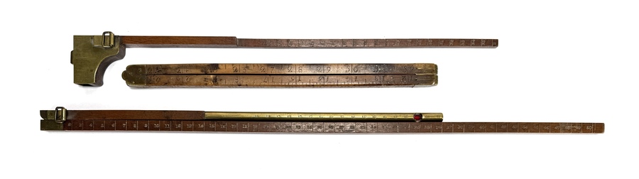 Maatstokken van G.C. Keij, vervaardigd uit hout en messing. Het lot omvat diverse specialistische meetinstrumenten, waaronder een vouwmeter en schuifmaten voorzien van fijn gegraveerde schaalverdelingen. Daterend uit de periode omstreeks 1900 en een Nederlandse herkomst.